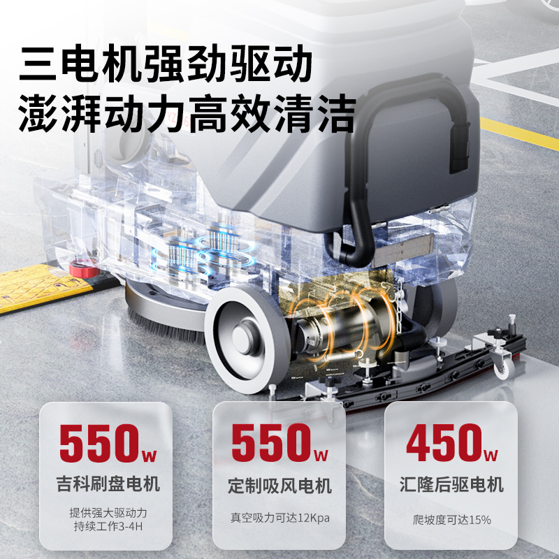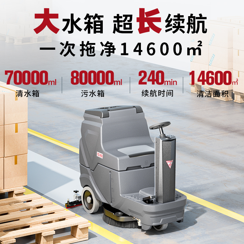 揚子駕駛式洗地機YZ-X68洗刷吸擦四效合一,耐高溫耐腐蝕滾塑機身,550W刷盤電機和550W吸風電機,雙層降噪隔音罩,清洗低至55DB,清潔效率4600㎡/h,適用于大面積場所。三電機強勁驅動,澎拜動力高效清潔,70L清水箱,80L污水箱,不用頻繁加水,可長時間清潔。